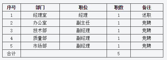 竞聘(述职)岗位、职数根据公司组织机构框架实际确定,本次竞聘所有岗位聘期为一年。具体岗位职数表见下表: