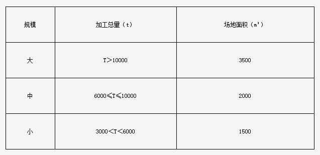 (一)钢筋加工应集中进行,每个合同段不宜设置超过两个钢筋加工场。钢筋加工场应采用钢结构搭设、顶部采用固定式拱形防雨棚,地面硬化,封闭式管理,棚内应设置龙门吊等专用吊装设备,场地内应按原材料堆放区、钢筋下料区、加工制作区、半成品堆放区、成品待检区、废料处理区等科学合理布置,功能明确,标识清晰。场地面积应根据钢筋(材)加工量的大小、工期等要求设置,一般不低于下表规定。